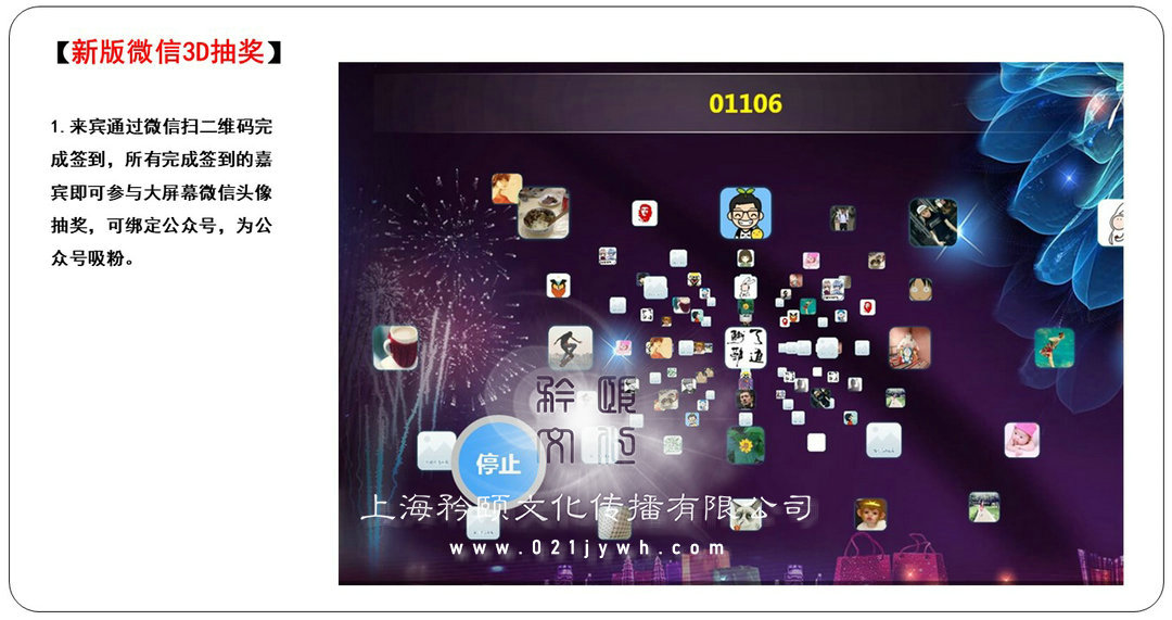 1.來賓通過微信掃二維碼完成簽到,所有完成簽到的嘉賓即可參與大屏幕滾動球體抽獎,抽取的是微信頭像和微信昵稱,也可實名抽取,每次最多抽取最多20名,中獎名單可導出,可定制成LOGO或上海年會活動主題。可綁定公眾號,為公眾號吸粉。