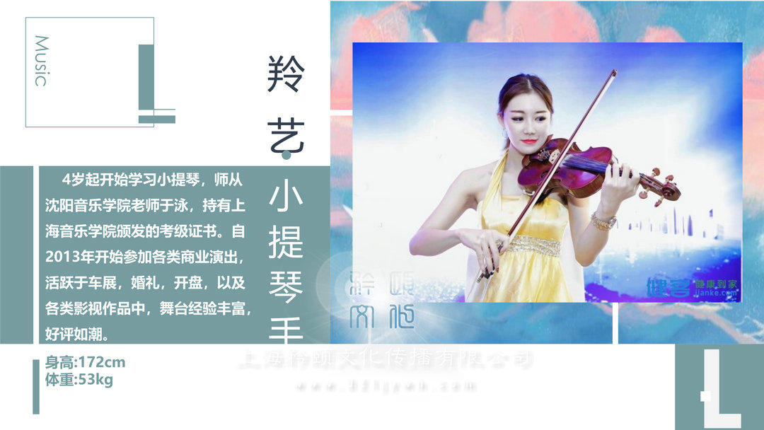 4歲起開始學習小提琴,師從沈陽音樂學院老師于泳,持有上海音樂學院頒發的考級證書。自2013年開始參加各類商業演出,活躍于車展,婚禮,開盤,以及