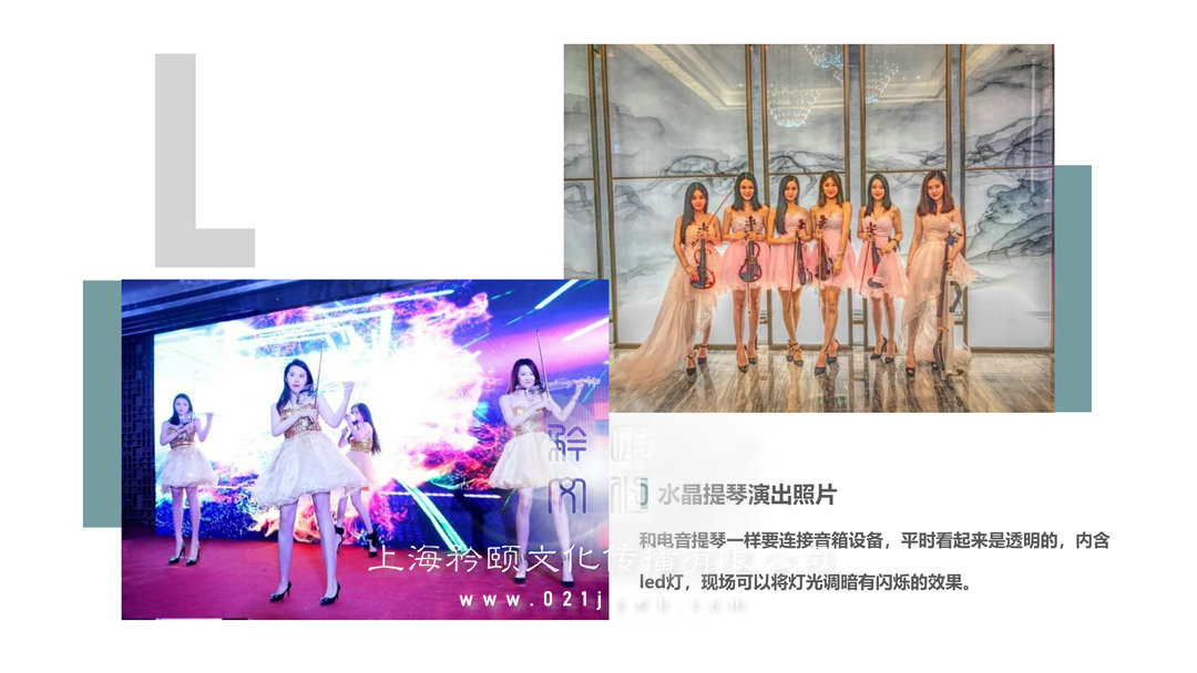 水晶提琴演出照片和電音提琴一樣要連接音箱設備,平時看起來是透明的,內含led燈,現場可以將燈光調暗有閃爍的效果。